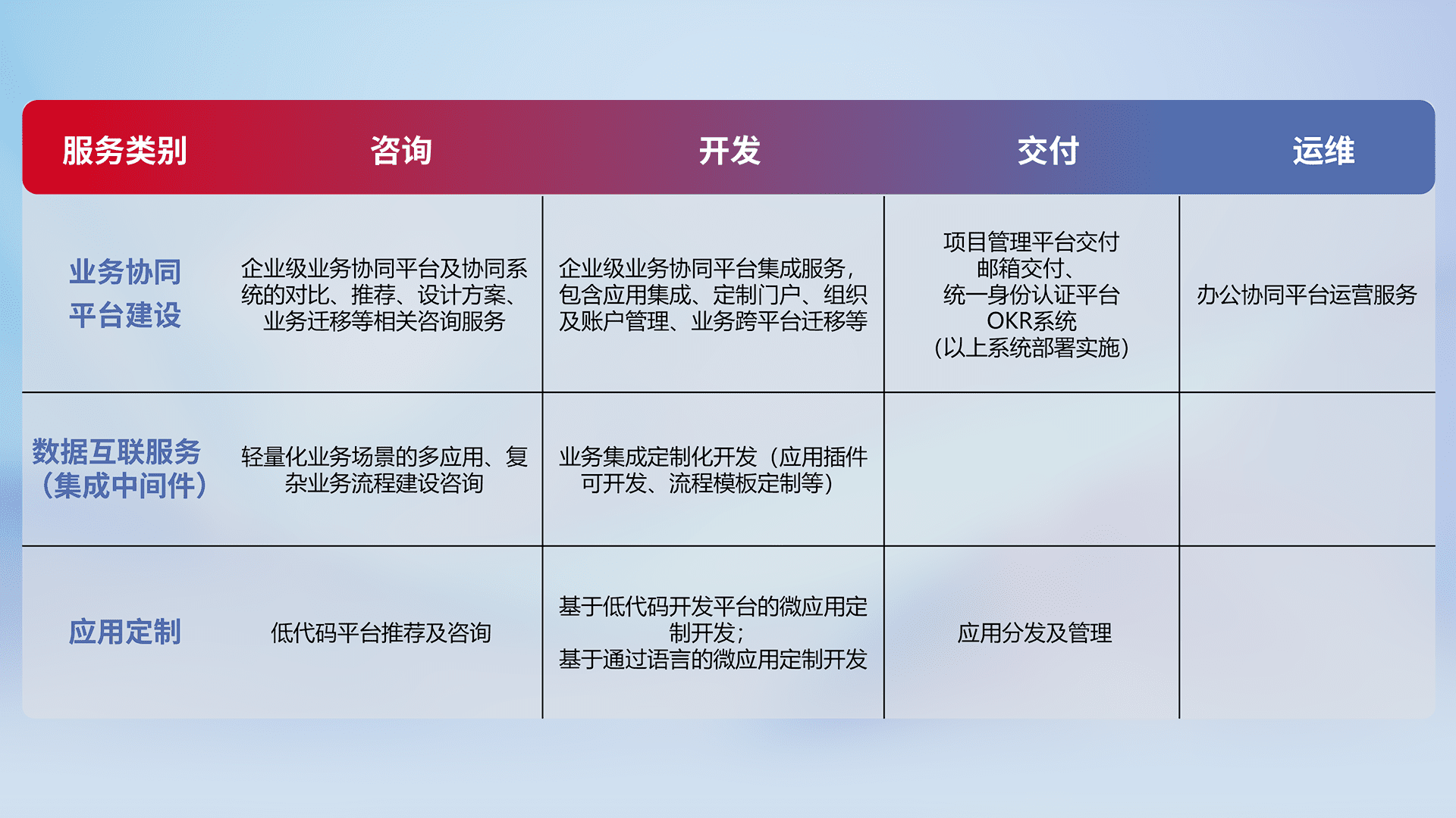 针对钉钉、、、企微、、、IDaas等平台级产品提供产品的规划、、方案、、、、交付、、定制化开发等服务,,实现如统一协同办公、、智能客户服务、、混合会议管理、、、智能数据查询、、等业务场景,,实现数字化转型。。。