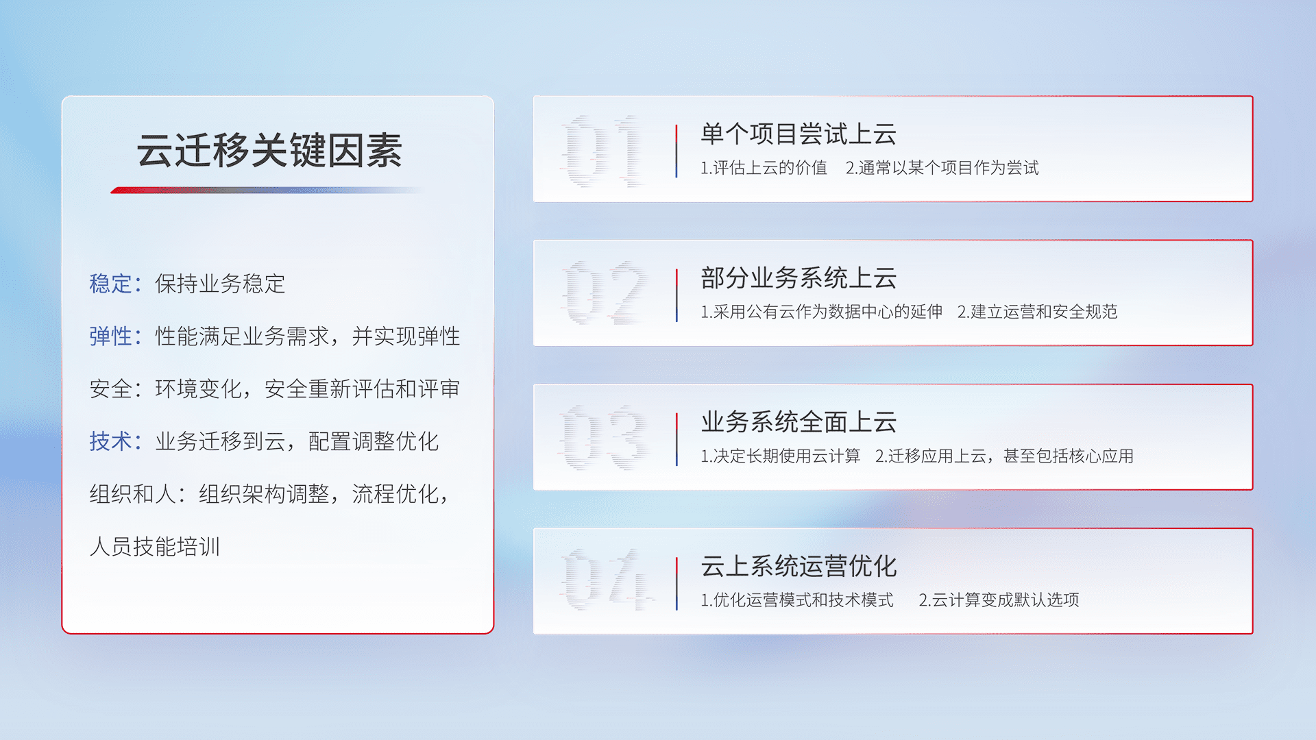 结合实际业务,,,,从规划设计、、、、云平台选型、、、云原生改造、、、数据迁移、、集成交付,,迁移全过程为客户识别最佳上云路径,,做好风险识别管理,,,设计网络架构、、身份权限、、、、安全审计合规、、、、操作审计、、、、日志审计、、、、监控告警策略、、、、多站点容灾设计等,,对云上基础设施进行整体规划,,,,提升IT治理水平,,,以满足弹性、、、高可用、、、高性能的需求。。。